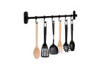 Čierna nástenná koľajnička na kuchynské náradie a koreničky