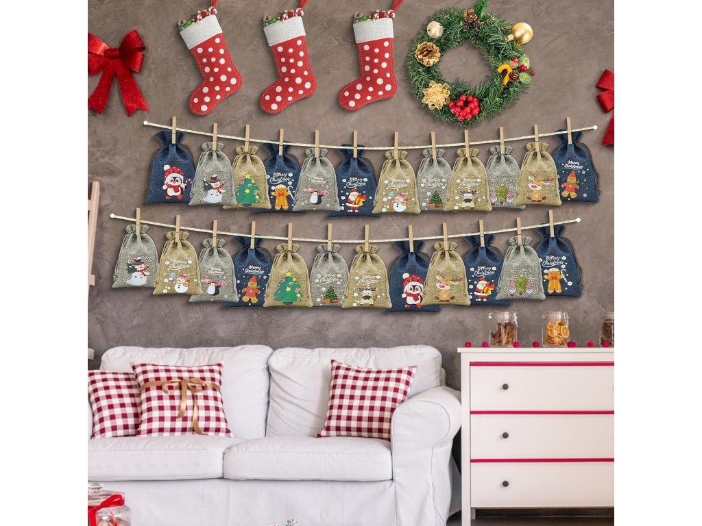 24 vrecúšok v troch farbách (béžová, sivá a tmavomodrá) je zdobených veselými vianočnými motívmi – Santa Claus, snehuliaci, stromčeky, soby či perníkový panáčik. Vďaka šnúrke a štipcom si jednoducho vytvoríte vlastnú vianočnú dekoráciu, ktorú využijete opakovane každý rok.