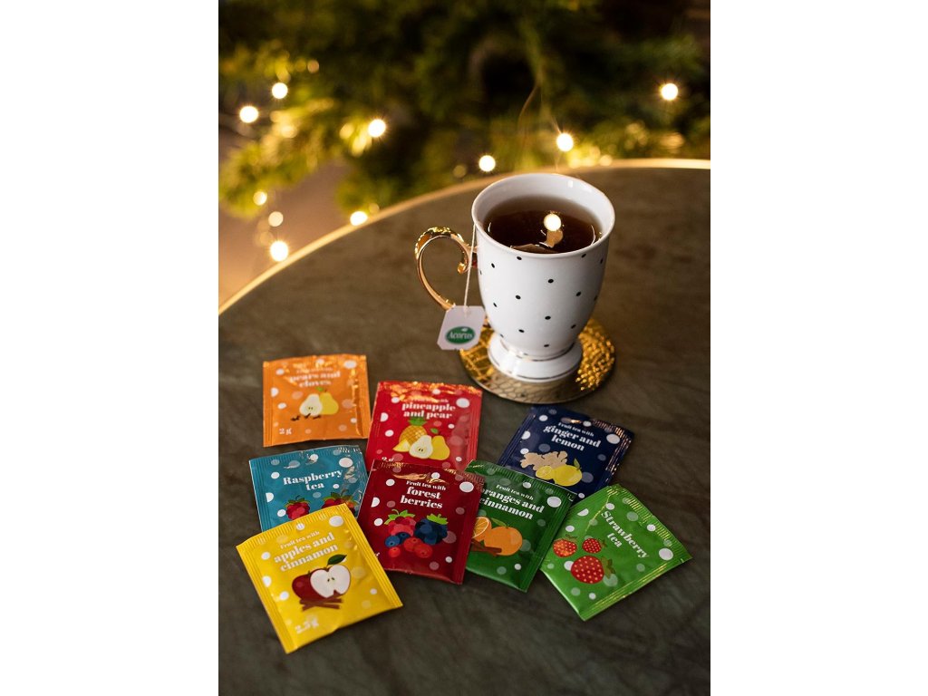 Adventný kalendár Acorus prináša 24 čajových vrecúšok, ktoré sú rozdelené do 8 rôznych príchutí. Každý deň vás poteší nový vianočný čajový rituál – od sladkastých ovocných tónov až po korenisté zimné zmesi. Čaje sú vyrobené zo 100 % prírodných ingrediencií bez umelých prísad, farbív a konzervantov.