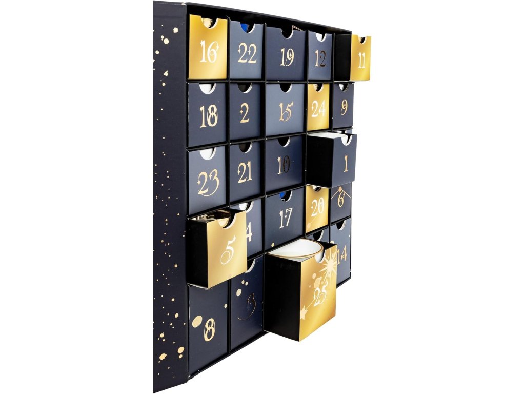 Kalendár je navrhnutý v elegantnom čierno-zlatom prevedení a vďaka svojmu luxusnému spracovaniu sa stane aj krásnym doplnkom interiéru. Sviečky sú vyrobené z kvalitného vosku a skla, v rôznych vôňach, ktoré navodia čarovnú sviatočnú atmosféru.