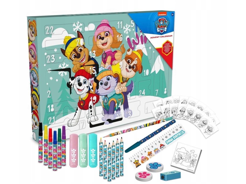 Adventný kalendár pre deti Labková patrola – pastelky, fixky, nálepky a omaľovánky