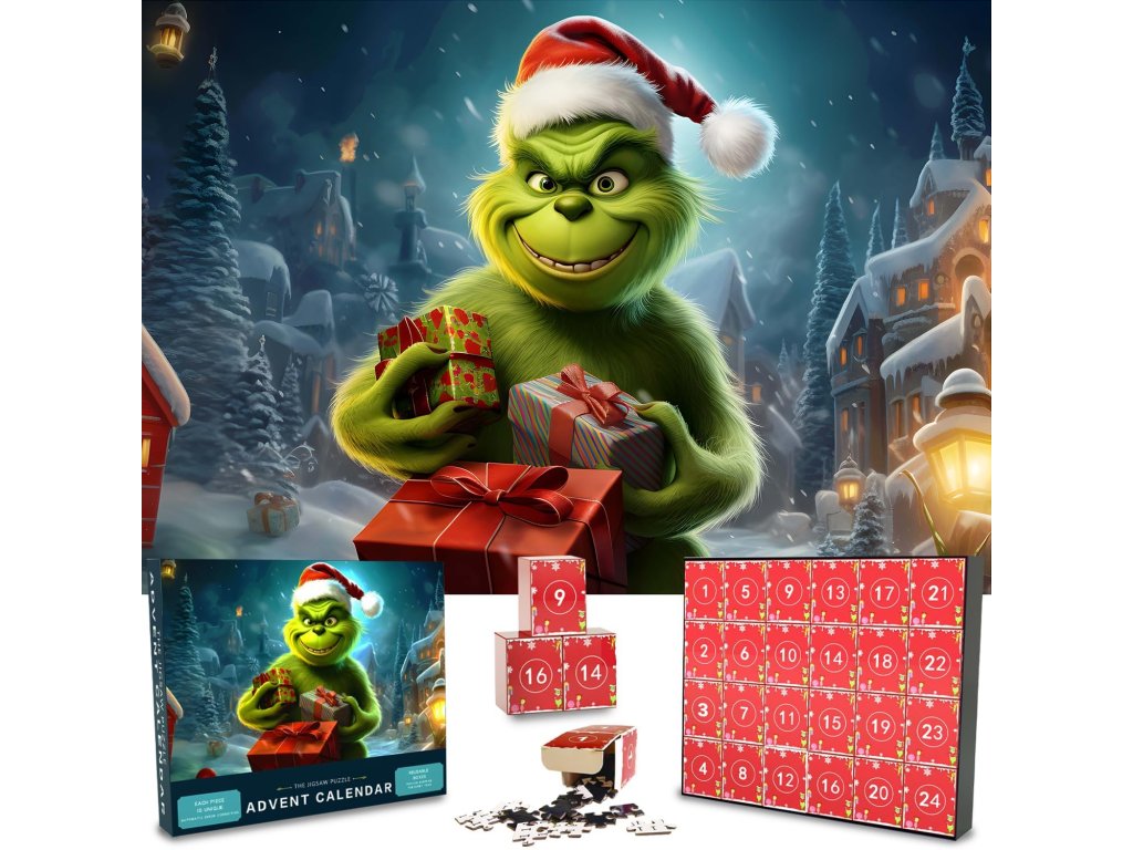 Zažite nezabudnuteľné Vianoce s adventným kalendárom puzzle Grinch. Kalendár ukrýva 1008 dielikov rozdelených do 24 očíslovaných krabičiek – každý deň od 1. do 24. decembra objavíte časť skladačky, až kým nevznikne celé vianočné dielo s motívom slávneho Grincha.