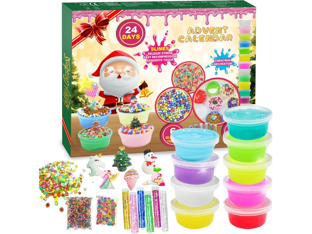 Adventný kalendár so slizom – 24 prekvapení pre deti (kryštálové a fluffy slizy, trblietky a doplnky)