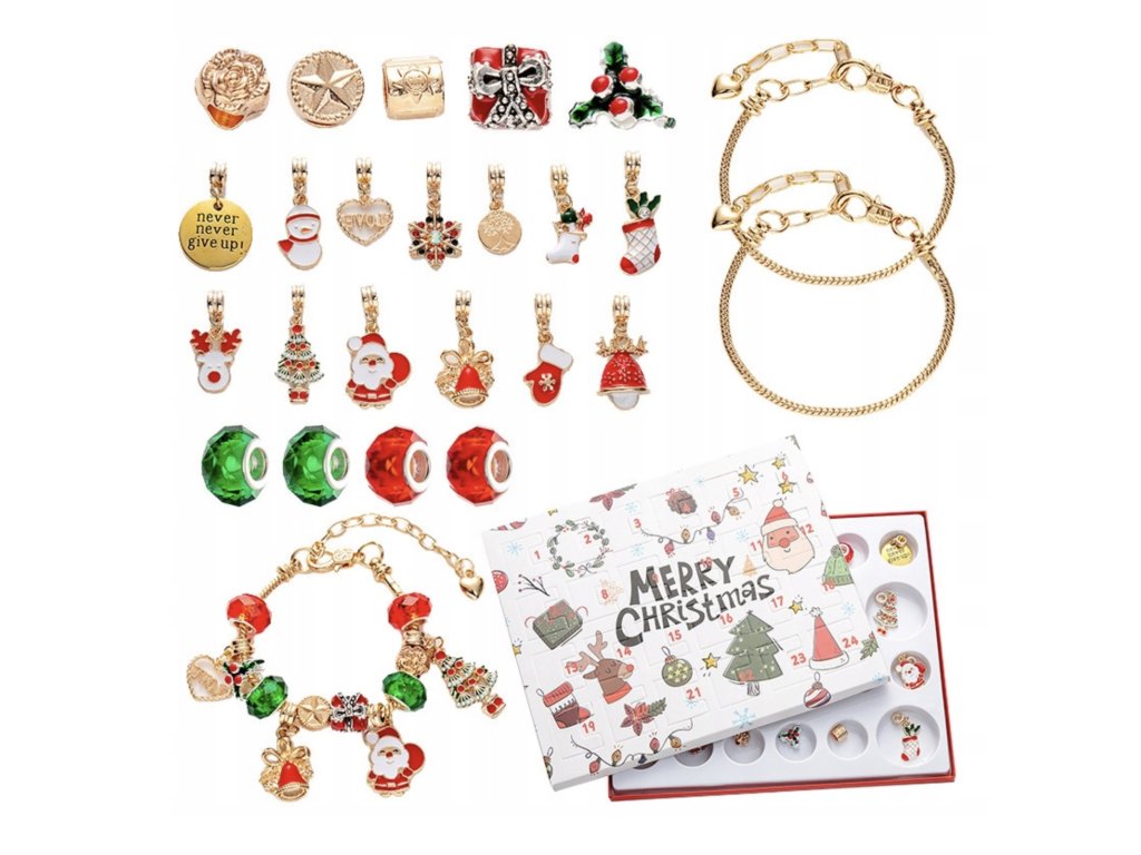 Adventný kalendár so šperkami – 2 náramky a 22 príveskov v zlatej farbe (pre ženy a dievčatá)