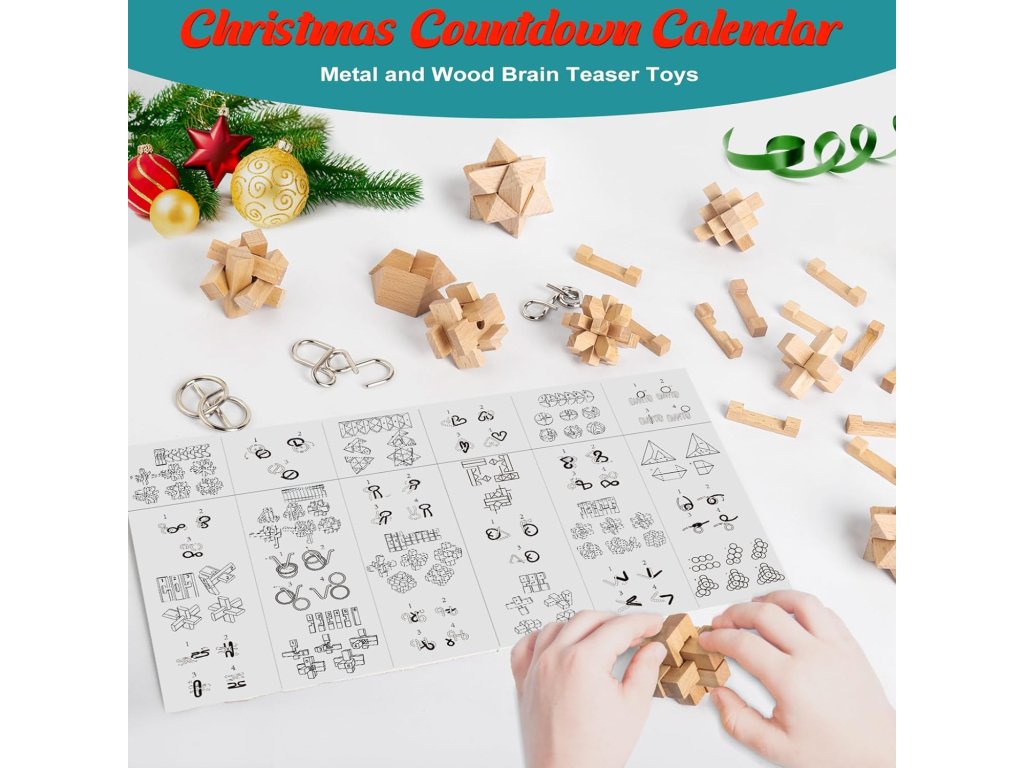 Adventný kalendár s hlavolamami 2025 – 24 drevených a kovových puzzle pre deti aj dospelých