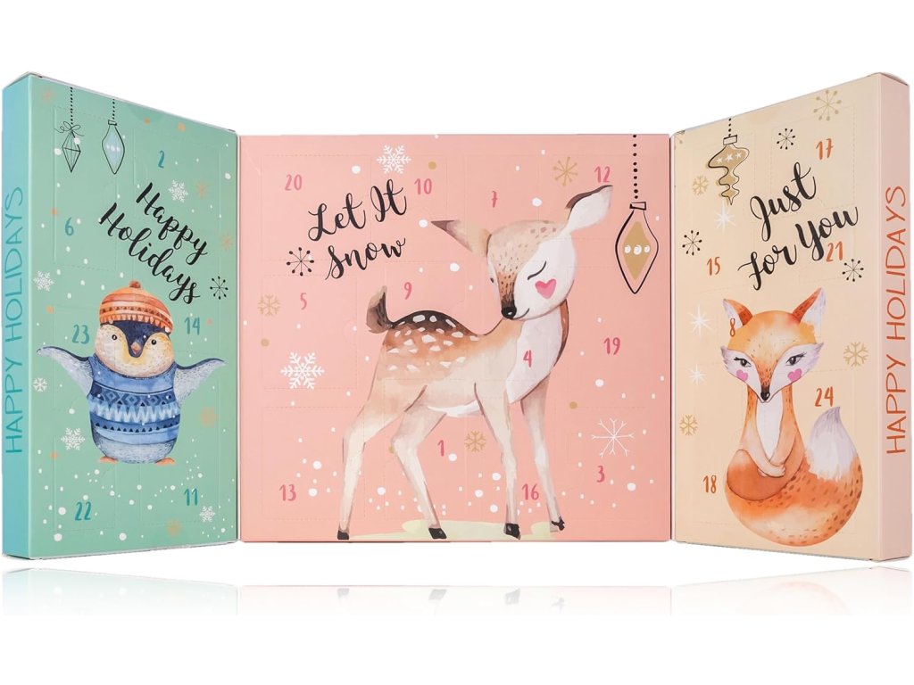 Svetlá zimná grafika so srnčekom, líštičkou a tučniakom skrýva 24 okienok plných radosti. Vnútri nájdete minisprcháče, šampóny, mydielka, soli do kúpeľa aj praktické doplnky na starostlivosť o nechty a pleť. Všetko v detských veľkostiach – ideálne na prvé kozmetické rituály.