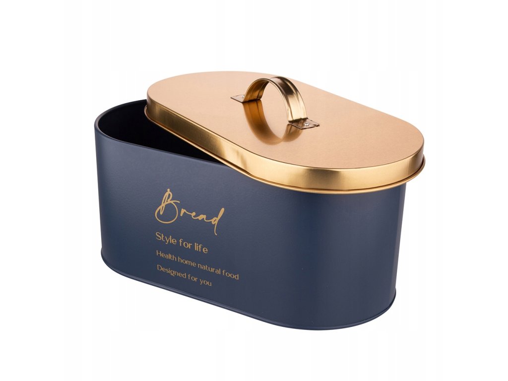 Štýlový kovový chlebník v módnej kombinácii modrej a zlatej farby je ideálnym doplnkom do modernej kuchyne. Kovová nádoba s vrchnákom z nehrdzavejúcej ocele chráni pečivo pred vysychaním a zachováva jeho čerstvosť. Vďaka hladkému tvaru a elegantnému nápisu pôsobí aj ako dizajnový prvok na kuchynskej linke.