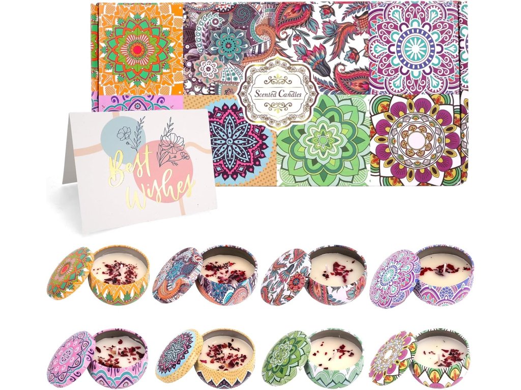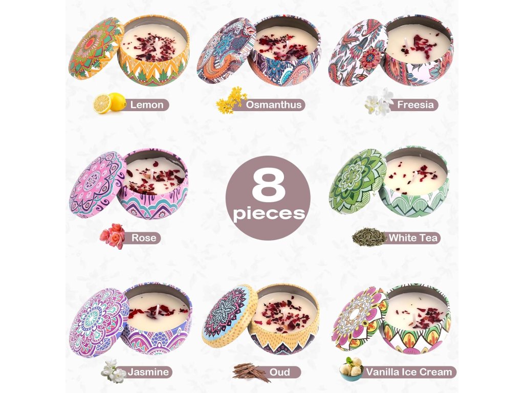 Darčeková kolekcia vonných sviečok – 8 sviečok v plechových dózach so sušenými kvetmi