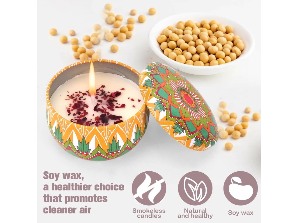 Táto kolekcia 8 vonných sviečok v elegantných plechových dózach poteší každého milovníka vôní a krásnych detailov. Každá sviečka ukrýva sušené kvety, ktoré pri horení dotvárajú jej jedinečný vzhľad a atmosféru. Vďaka sójovému vosku a bavlnenému knôtu horia sviečky čisto, bez dymu a s dlhou výdržou. Po vyhorení môžete dózy použiť znovu – na dekorácie, drobnosti či ako malé úložné nádoby.