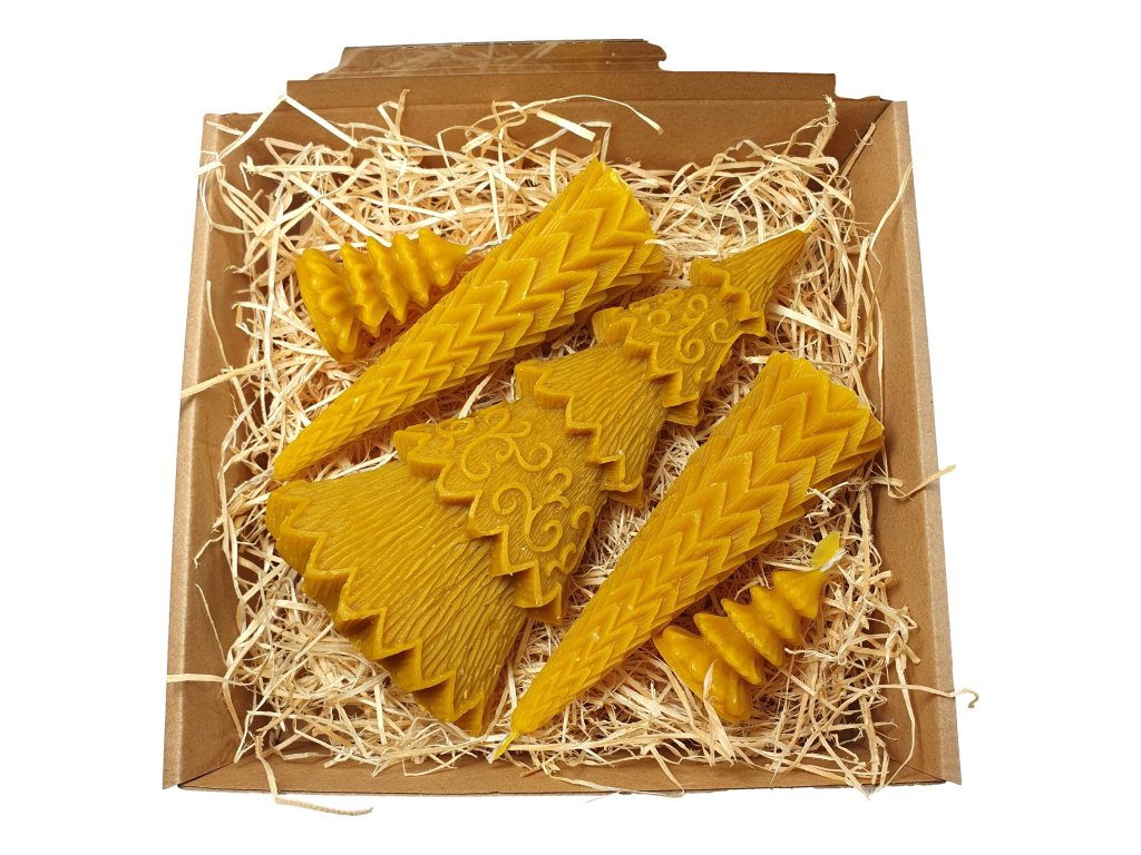 Vianočný darčekový box zo včelieho vosku – 5 sviečok v tvare stromčekov