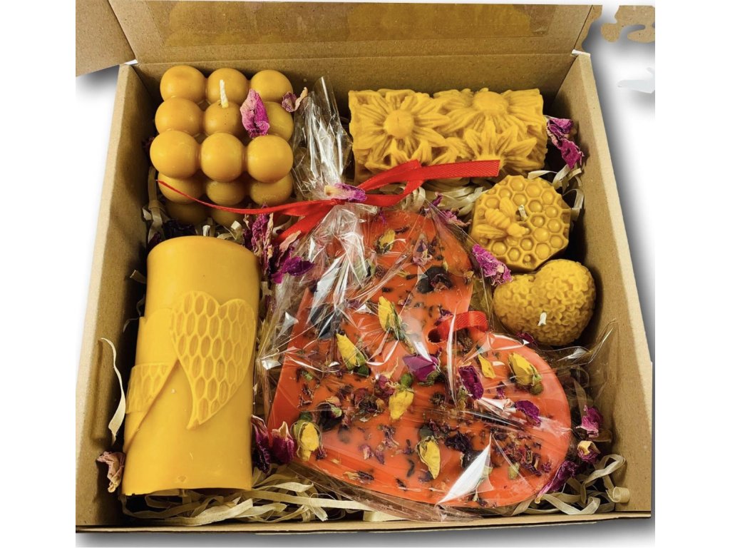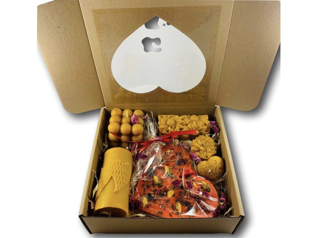 Čarovný darčekový box zo včelieho vosku – 5 sviečok a voňavé srdce