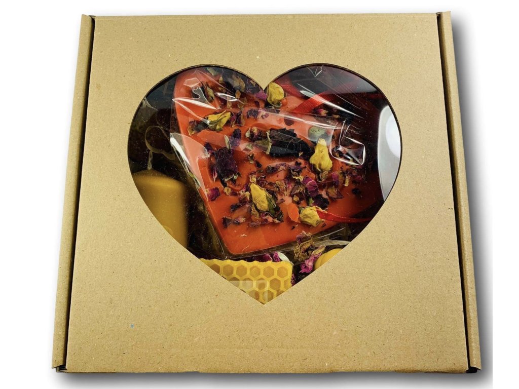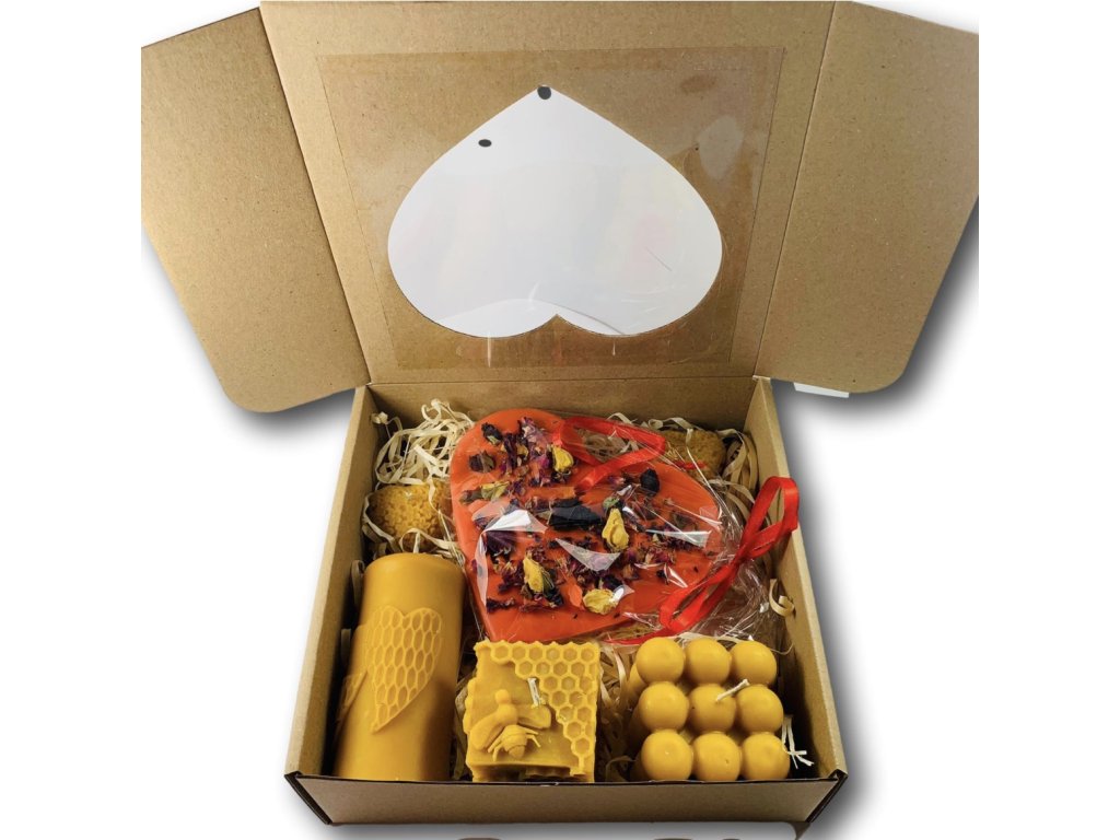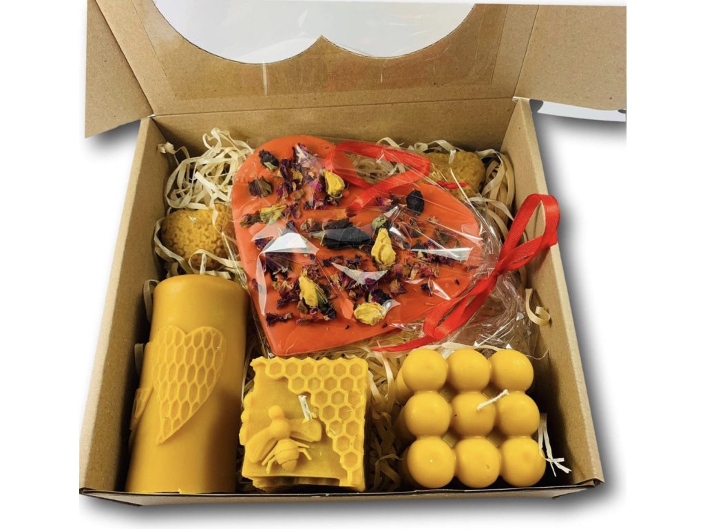Darčekový box s ručne robenými sviečkami z včelieho vosku a voňavým srdiečkom