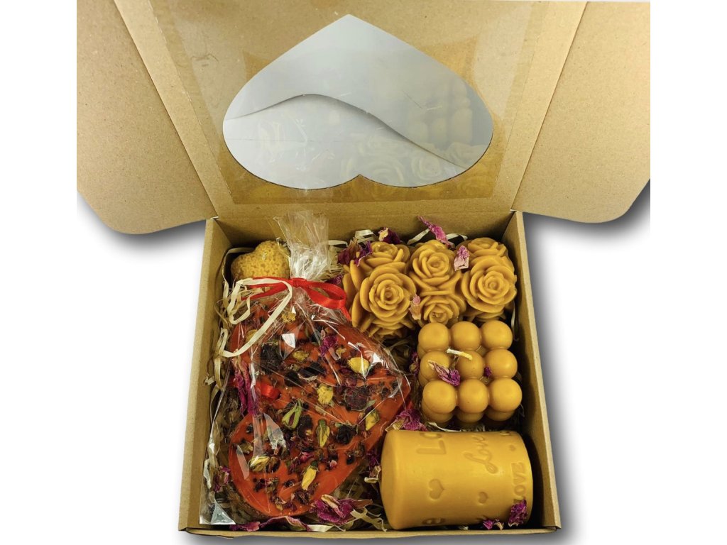 Romantický darčekový set zo 100% včelieho vosku je výnimočným prekvapením pre každého milovníka prírodných vôní, estetiky a ručnej výroby. Obsahuje 4 jedinečné sviečky v rôznych tvaroch a voňavé srdce so sušenými kvetmi a korením. Všetko je zabalené v štýlovej krabičke s okienkom v tvare srdca, vystlanej drevitou vlnou a dekorovanej sušenými lupeňmi. Skvelý darček na Valentína, narodeniny, výročie aj ako jemná pozornosť zo srdca.