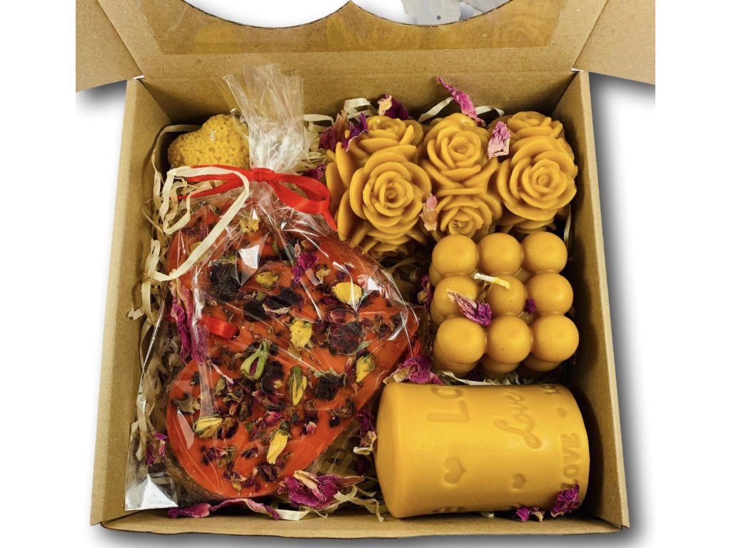 Čarovný darčekový box z včelieho vosku – 4 sviečky a voňavé srdce
