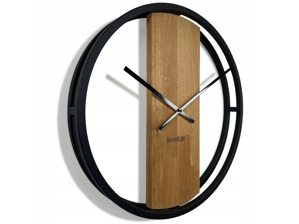 Nástenné hodiny v industriálnom štýle sú dizajnovým kúskom, ktorý zaujme na prvý pohľad. Robustný čierny kovový rám v tvare dvojitého kruhu v sebe ukrýva krásny drevený ciferník z dubovej preglejky, ktorý vnáša do priestoru teplo a prirodzenosť. Minimalistické čierne ručičky bez tikotu dopĺňajú celkový vzhľad a zabezpečujú absolútne tichý chod bez rušivých zvukov.