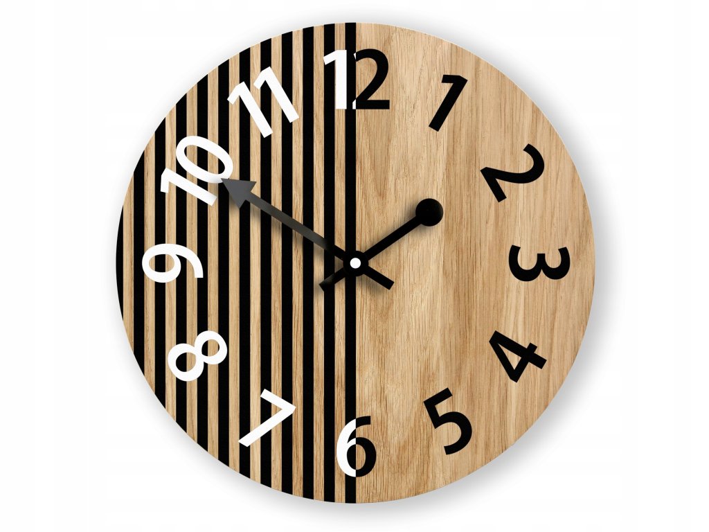 Dizajnové nástenné hodiny s dubovým efektom a čiernymi pruhmi – Ø 30 cm