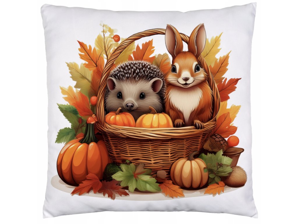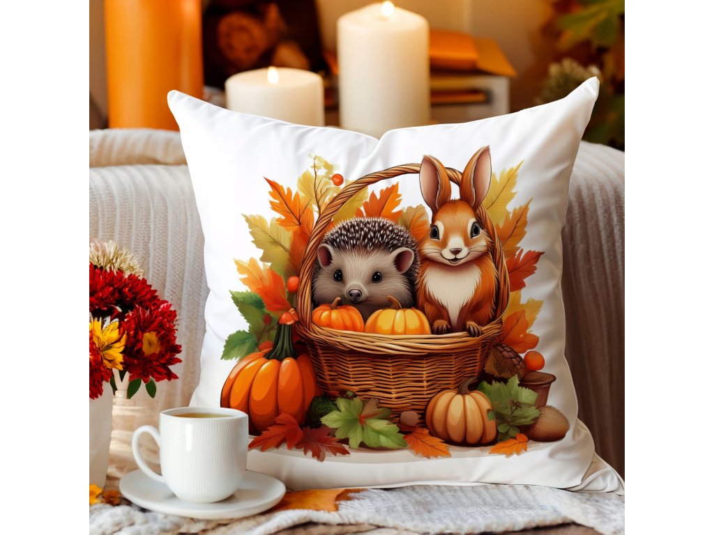 Jesenná obliečka na vankúš 40×40 – Ježko a zajačik v košíku s tekvicami