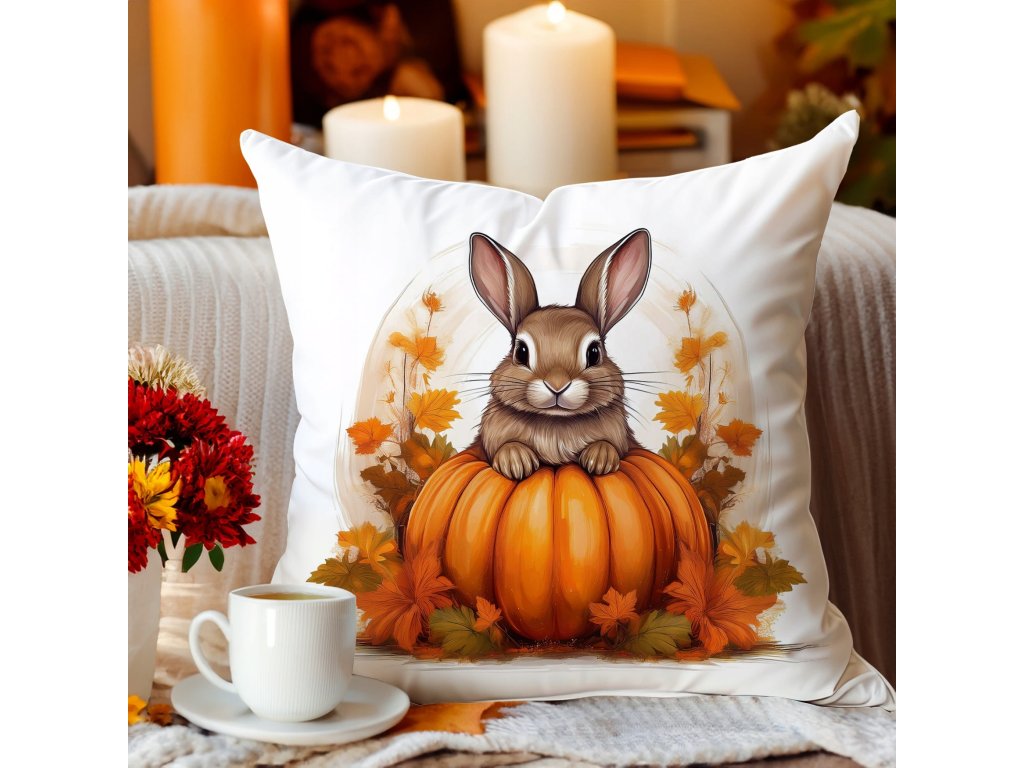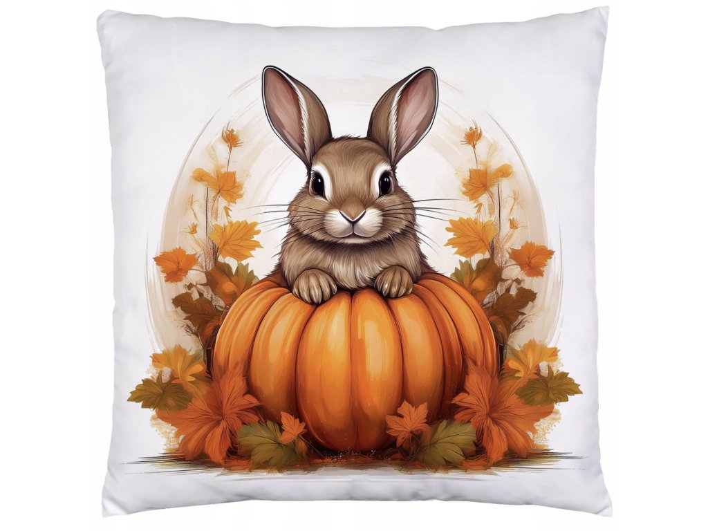 Jesenná obliečka na vankúš 40×40 – Zajačik na tekvici v jesennom lístí