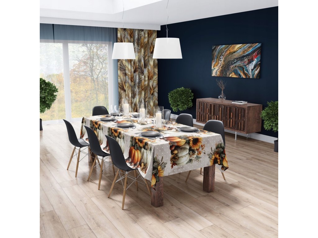 Tento jesenný obrus s motívom tekvíc, slnečníc a žaluďov rozžiari váš stôl farbami a prinesie do interiéru radostnú atmosféru jesene. Kombinácia oranžových a krémových tekvíc, jesenných listov a drobných bodiek na svetlom podklade pôsobí útulne a dekoratívne. Vďaka teflónovej povrchovej úprave je obrus vodoodolný, odolný voči škvrnám a vhodný na každodenné používanie.