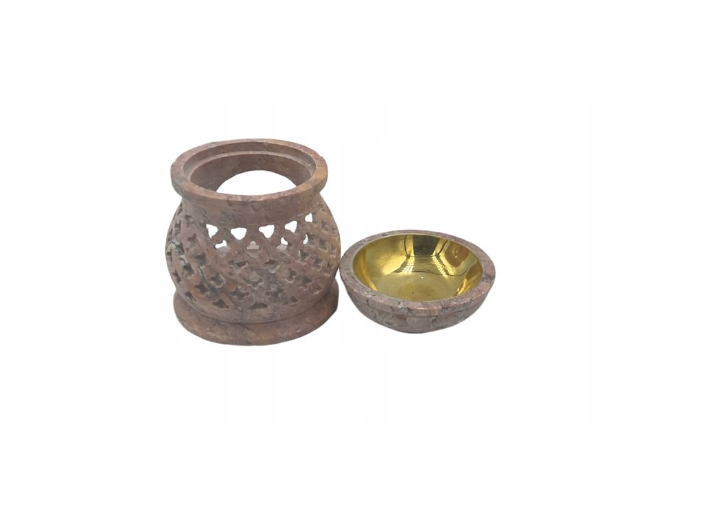 Dvojdielna aróma lampa z mydlového kameňa s odnímateľnou mosadznou miskou je skutočným umeleckým dielom remeselnej výroby. Precízne vyrezávaný prelamovaný vzor vytvára pôsobivú hru svetla počas horenia sviečky a zároveň slúži ako stabilný podstavec pre vonnú esenciu. Každý kus je jedinečný – ručne vyrobený z prírodného kameňa. Vďaka kombinácii kvalitného materiálu a remeselnej práce sa skvele hodí ako darček aj ako štýlový doplnok pre domácu aromaterapiu.