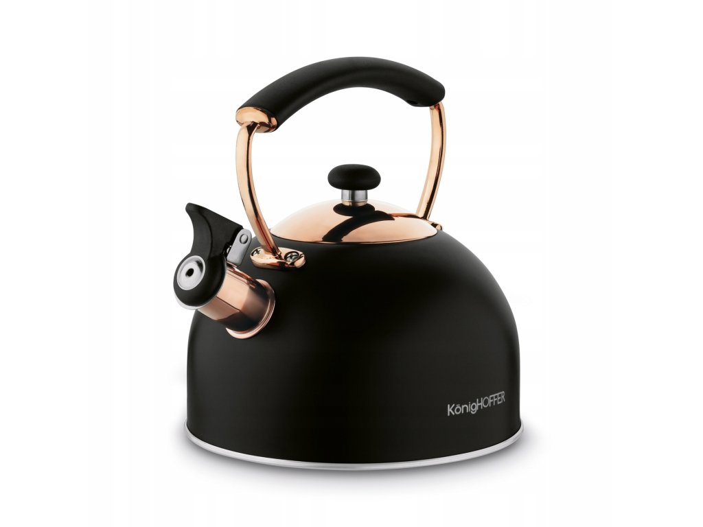 Elegantná čajová kanvica z nerezovej ocele v čiernom matnom prevedení so štýlovými medenými detailmi je ideálnym doplnkom do každej kuchyne. S objemom 2,3 litra je vhodná na prípravu horúcich nápojov pre celú rodinu. Praktická píšťalka vás vždy upozorní, keď sa voda začne variť, zatiaľ čo ergonomická bakelitová rukoväť poskytuje pohodlie a ochranu pred popálením.