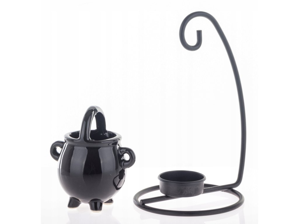 Aromalampa v tvare čarodejníckeho kotlíka na kovovom stojane – čierna keramika 17,5 cm