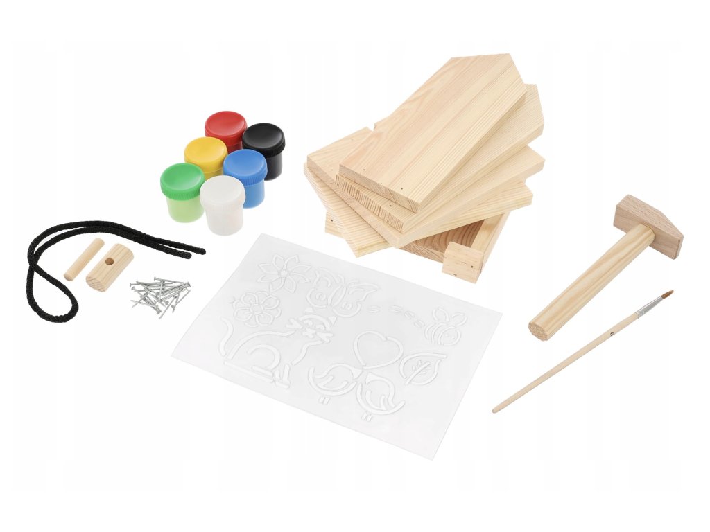 - Obsah balenia: drevené diely, klince, kladivko, šnúrka, farby, štetec, šablóny
