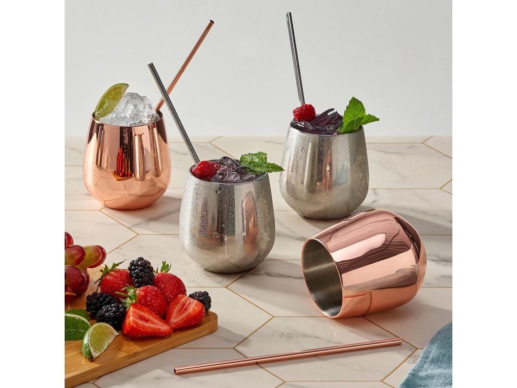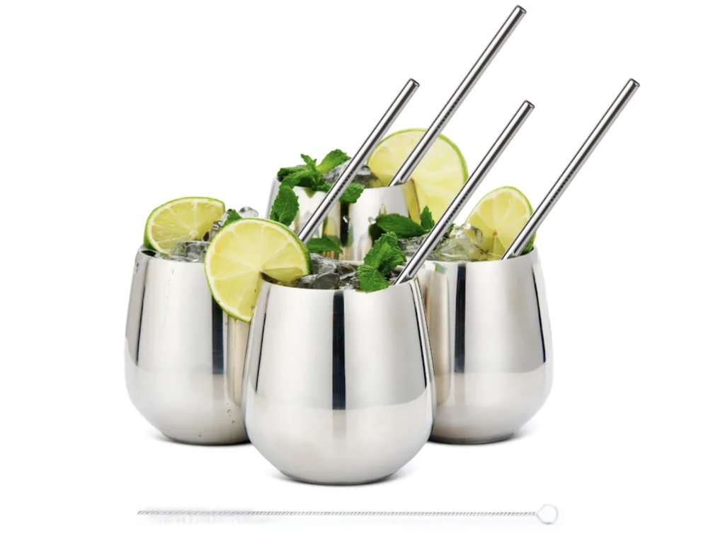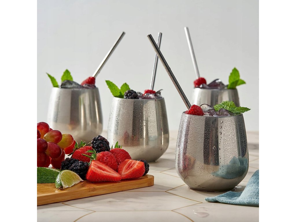 Sada 4 nerezových pohárov na drinky – strieborný lesklý dizajn 350 ml + slamky
