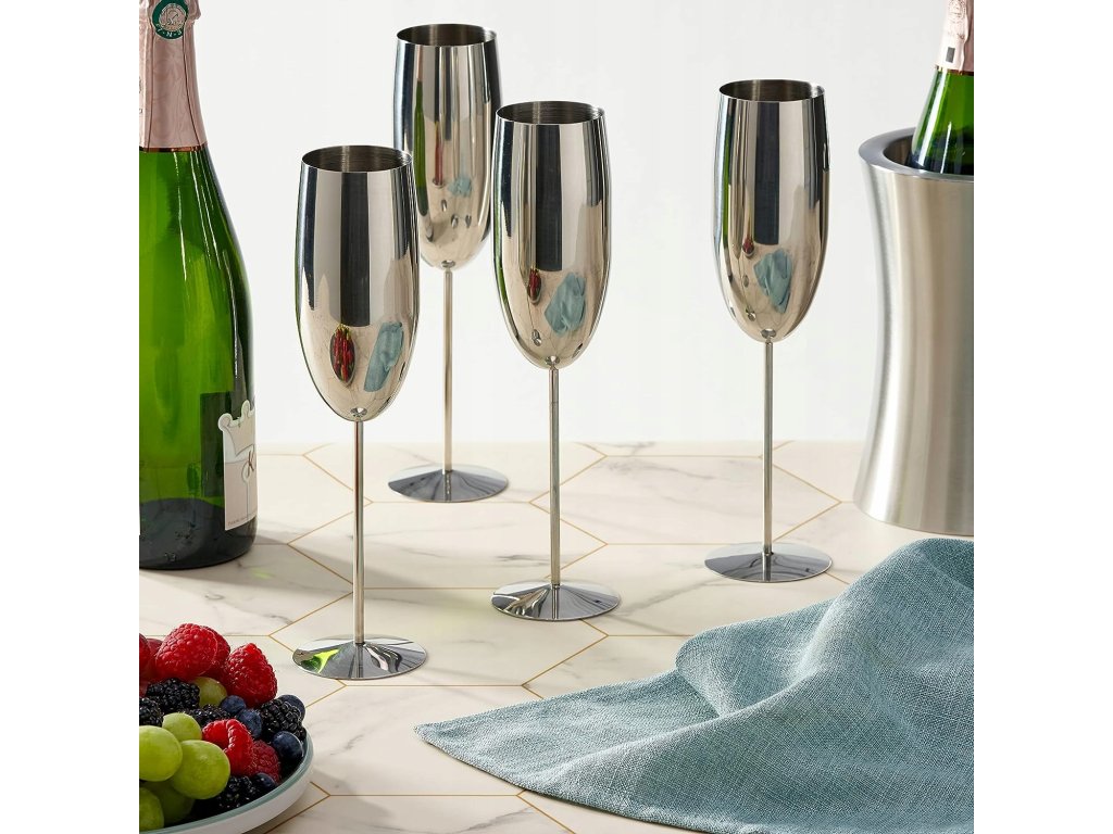 Táto sada 4 pohárov na šampanské v striebornej farbe je kombináciou luxusu a praktickosti. Vďaka nerezovej oceli sú poháre nerozbitné, odolné a udržia nápoj chladný dlhšie než klasické sklo. Ich minimalistický dizajn so zrkadlovým leskom perfektne zapadne do moderných aj glamour aranžmánov.