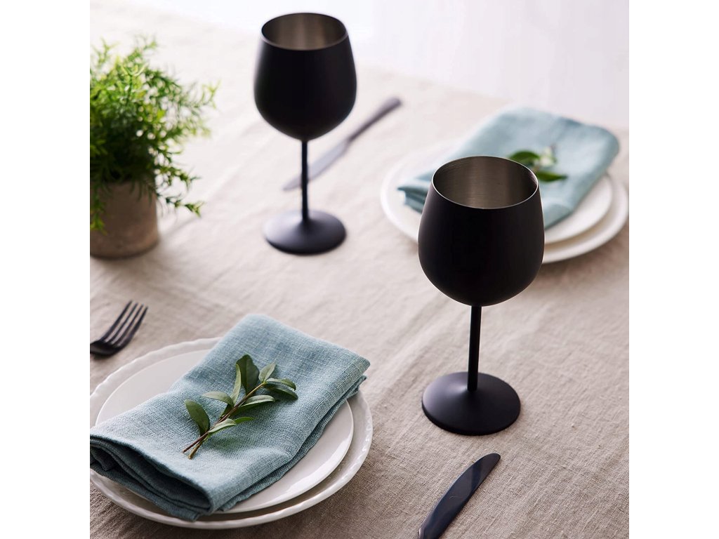 Táto sada 4 nerezových pohárov na víno v čiernom matnom prevedení spája moderný minimalizmus s praktickosťou. Ich štýlový povrch dodá stolovaniu nádych luxusu a originality, vďaka čomu sa stanú ozdobou každej oslavy či rodinného stretnutia.