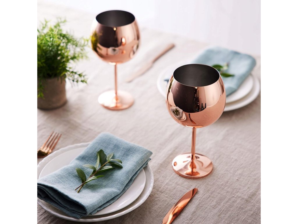 Tieto luxusné nerezové poháre v ružovo-zlatom lesklom dizajne dodajú prestretému stolu elegantný a moderný vzhľad. Vďaka objemu 650 ml a širokej čaši sú ideálne na červené vína, ktoré potrebujú priestor na rozvinutie arómy. Zároveň ich však môžete použiť aj na gin tonic, miešané koktaily alebo dezerty servírované s ľadom.