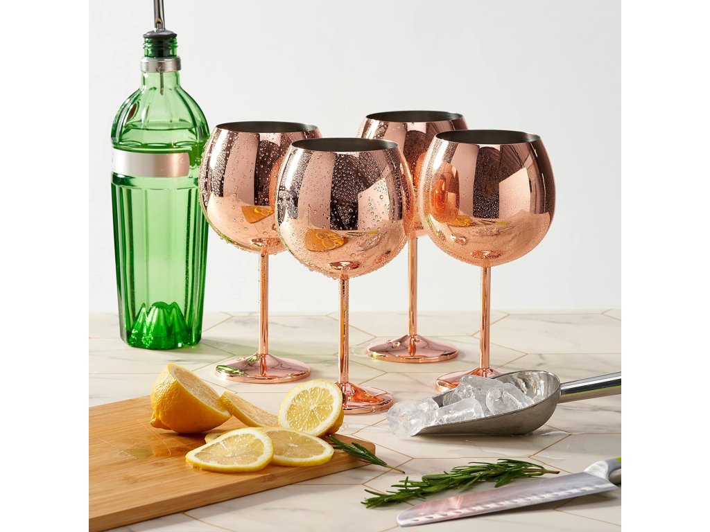 Sada 4 nerezových pohárov na červené víno a koktaily – elegantný ružovo-zlatý lesk 650 ml