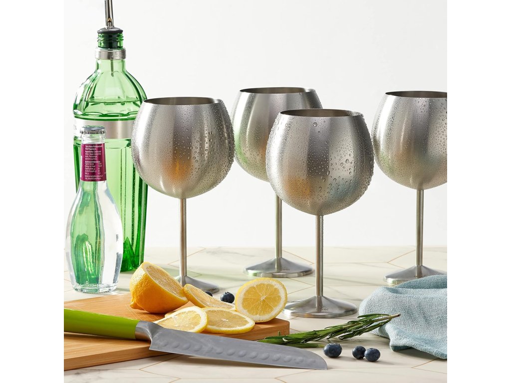 Táto sada 4 pohárov z nerezovej ocele v striebornom matnom prevedení spája luxusný vzhľad s odolnosťou. Vďaka širokej čaši a objemu 650 ml sú ako stvorené na červené vína, ktoré potrebujú priestor na plné rozvinutie vône. Zároveň sa perfektne hodia na gin tonic, miešané drinky alebo osviežujúce koktaily s ľadom.