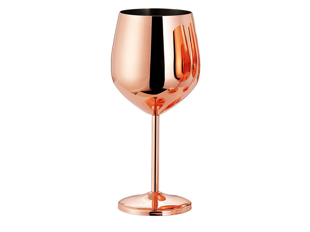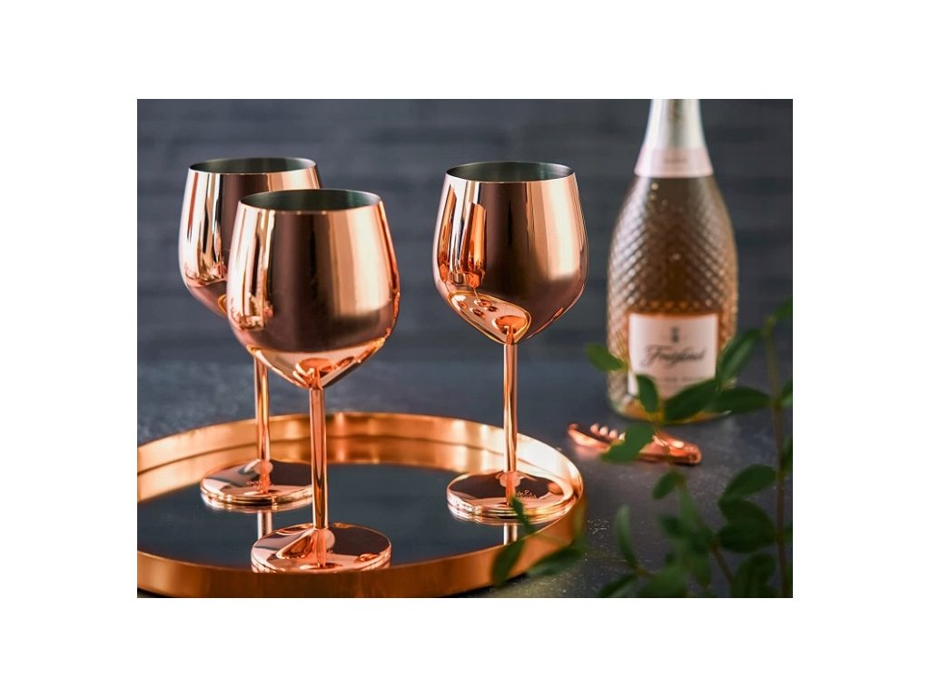 Tento nerezový pohár na víno v ružovo-zlatom lesklom prevedení je štýlovým doplnkom, ktorý ozdobí každé stolovanie. Minimalistický dizajn a moderný metalický odtieň sa hodia do glamour aj moderných interiérov a perfektne vyniknú na svadbách, oslavách či pri romantickej večeri.