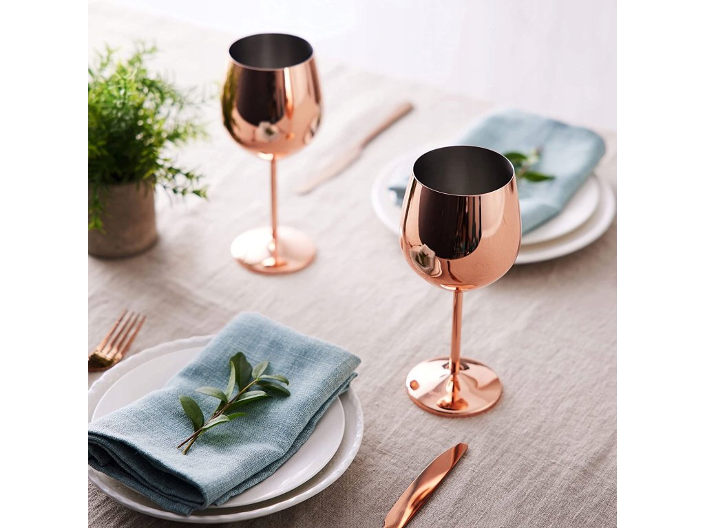 Táto sada 4 nerezových pohárov na víno v ružovo-zlatom lesklom prevedení je perfektným doplnkom pre každé stolovanie. Ich minimalistický dizajn a žiarivý kovový odtieň dodajú elegantný nádych svadbám, rodinným oslavám aj štýlovým večierkom.