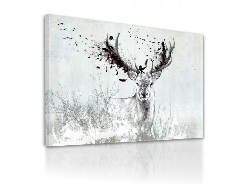 Moderný obraz na plátne s jemne zasneným pozadím a majestátnym jeleňom v centre pozornosti je výnimočným kúskom pre milovníkov prírody aj umenia. Originálne spracovanie parohov v podobe rozplývajúcich sa pierok a čiernych akcentov vytvára abstraktnú a zároveň dynamickú kompozíciu, ktorá pôsobí ako spojenie prírody a fantázie. Vďaka použitým farbám v odtieňoch sivej, bielej a čiernej sa obraz dokonale hodí do škandinávskeho alebo minimalistického interiéru.