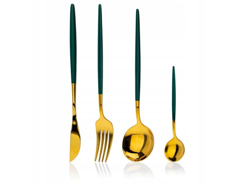 Luxusná súprava príborov v zlatej farbe so smaragdovými rukoväťami pre elegantné stolovanie. Vyrobené z nehrdzavejúcej ocele, ideálne na sviatočné aj každodenné použitie.