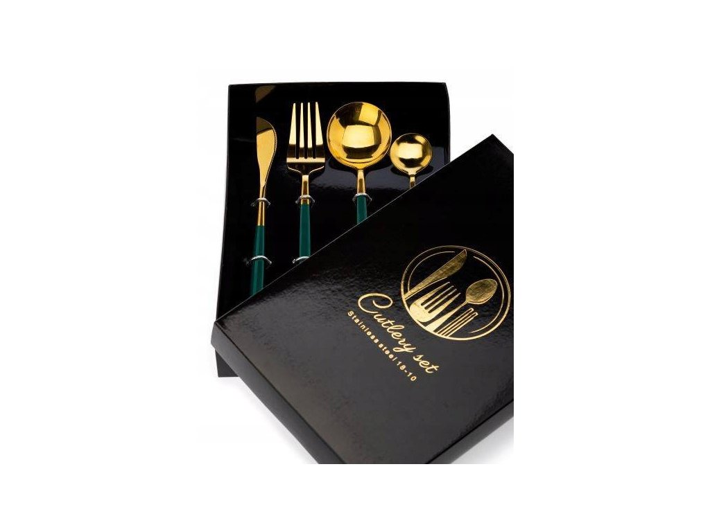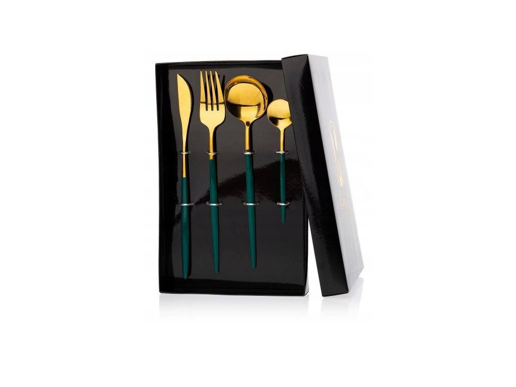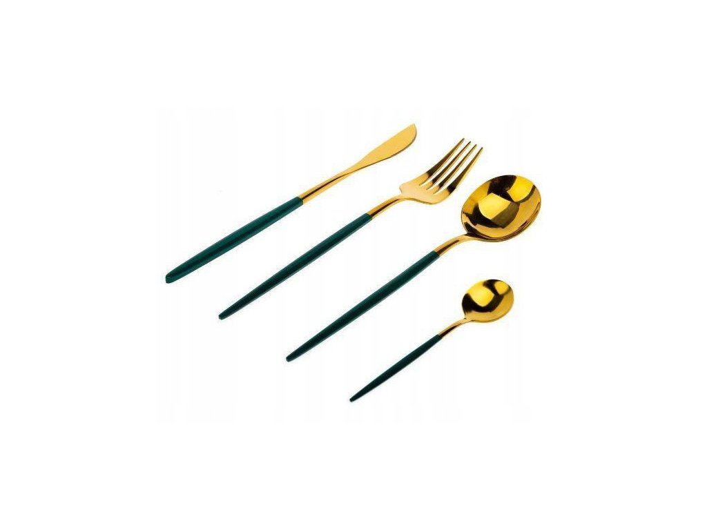 Zlatý príbor so smaragdovou rúčkou – 4-dielna sada z nehrdzavejúcej ocele