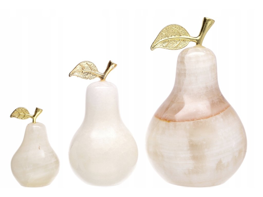 Dekoračná hruška z onyxu je nádhernou ukážkou toho, ako príroda dokáže vytvoriť umelecké dielo. Každý kus je vyrezávaný z jedného bloku prírodného kameňa, vďaka čomu má unikátnu kresbu a jemný, prírodný lesk. Elegantný kovový lístok v zlatom prevedení podčiarkuje luxusný dojem a z hrušky robí štýlový doplnok do domácnosti, kancelárie alebo ako darček.
