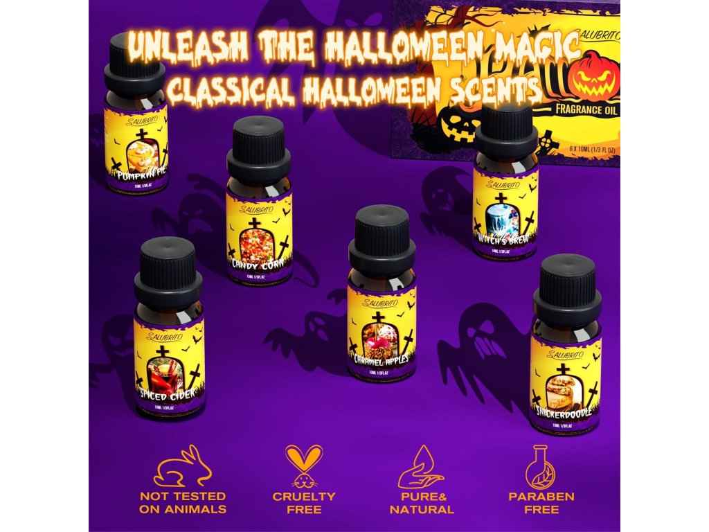 Olejová sada je balená v praktických 10 ml fľaštičkách, ideálna na použitie v difuzéroch, sviečkach, mydlách či DIY kozmetike. Je to perfektný tip na darček pre všetkých, ktorí milujú Halloween, vône a tvorivú atmosféru.