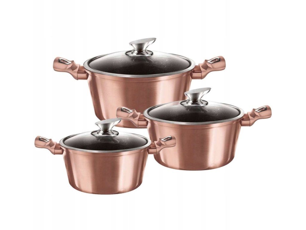Táto 6-dielna súprava hrncov v modernom medenom dizajne je ideálnou voľbou pre každého, kto hľadá štýl, funkčnosť a vysokú odolnosť. Hrnce sú vyrobené z odlevaného hliníka s granitovým nepriľnavým povrchom, ktorý zaručuje rovnomerné rozloženie tepla a možnosť varenia s minimom tuku.