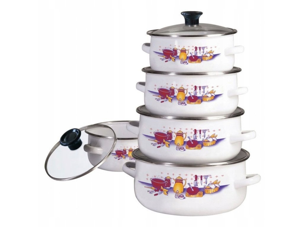 Táto praktická sada 5 smaltovaných hrncov so sklenenými pokrievkami je ideálnou voľbou pre každú domácnosť. Hrnce majú tradičný dizajn s veselou kuchynskou potlačou, vďaka čomu budú nielen užitočným nástrojom, ale aj ozdobou vašej kuchyne.