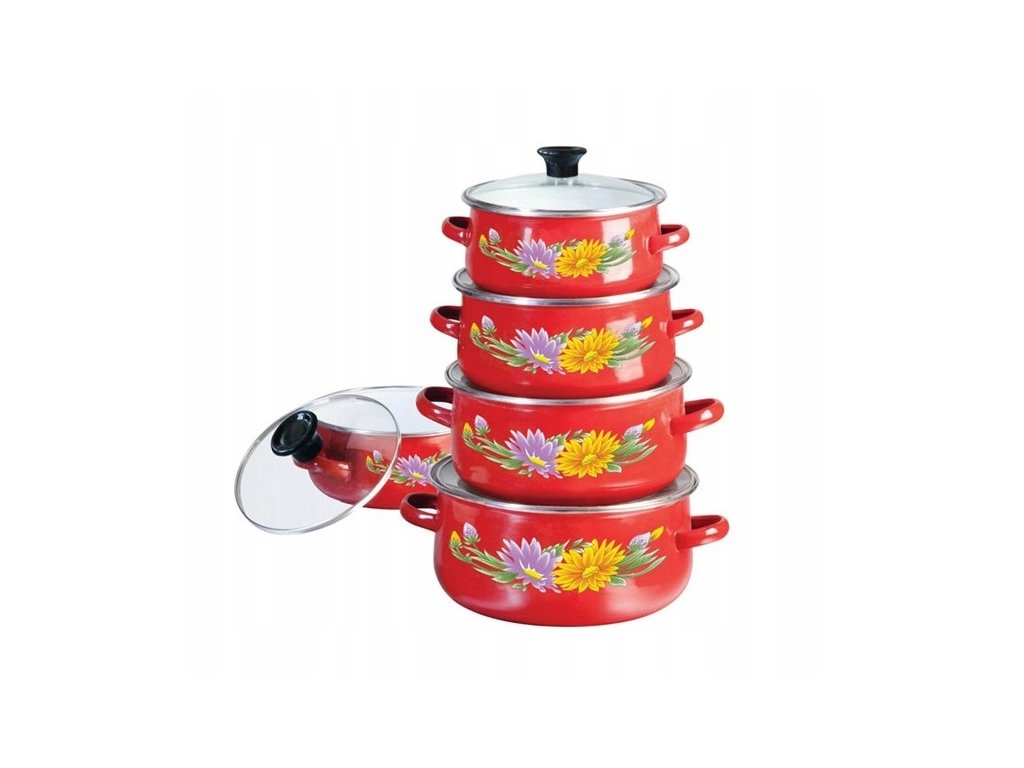 Súprava 5 smaltovaných hrncov s kvetinovým motívom – červené