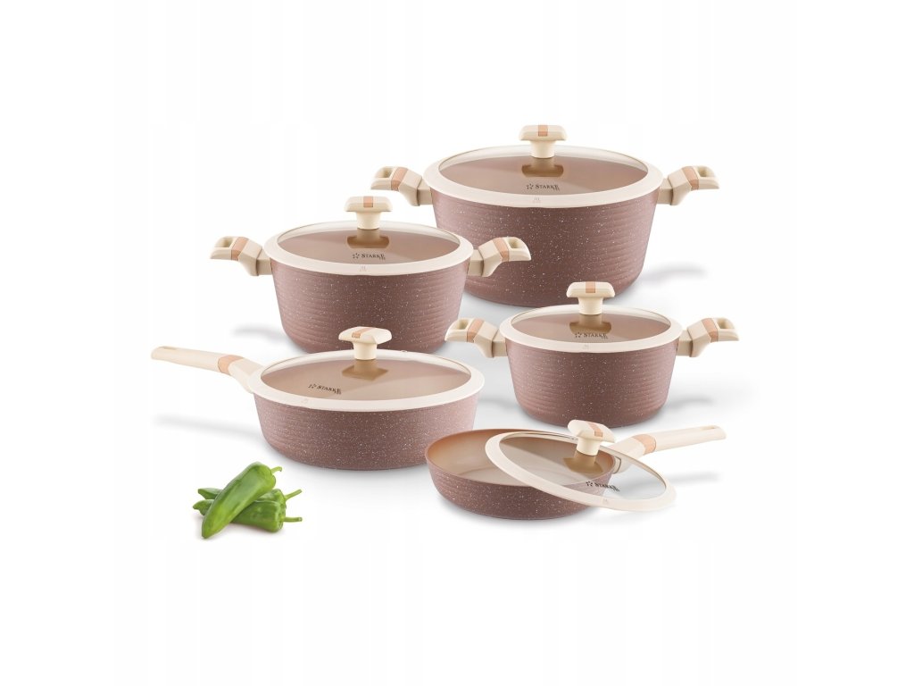 10-dielna sada hrncov a panvíc v elegantnom hnedo-krémovom dizajne ponúka všetko, čo potrebujete na efektívne a zdravé varenie. Nepriľnavý povrch bez PFOA zaručuje jednoduché čistenie a minimálne použitie tuku. Hrnce aj panvice sú vybavené antisklzovými rukoväťami soft touch a sklenenými pokrievkami s odvzdušňovačom a silikónovým okrajom. Indukčné dno zabezpečuje rovnomerné rozloženie tepla a úsporu energie. Skvelé pre každodenné použitie na všetkých typoch sporákov.