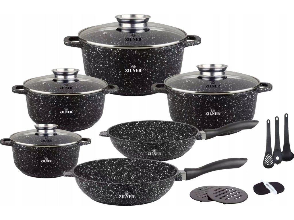 Súprava hrncov a panvíc 17 ks – čierna s bielym mramorom, vrátane doplnkov
