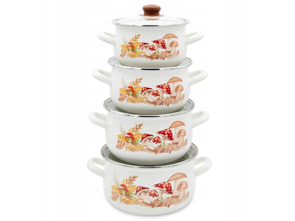 Smaltovaná sada hrncov so vzorom húb – 8 dielov s pokrievkami