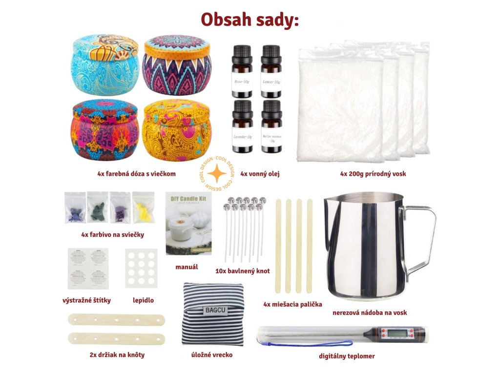 Sada je vhodná pre začiatočníkov aj pokročilých. Obsahuje detailný návod, teplomer, knôty, vosk, vône aj príslušenstvo na jednoduchú prípravu. Ideálna na relax, tvorenie s rodinou alebo ako originálny darček.
