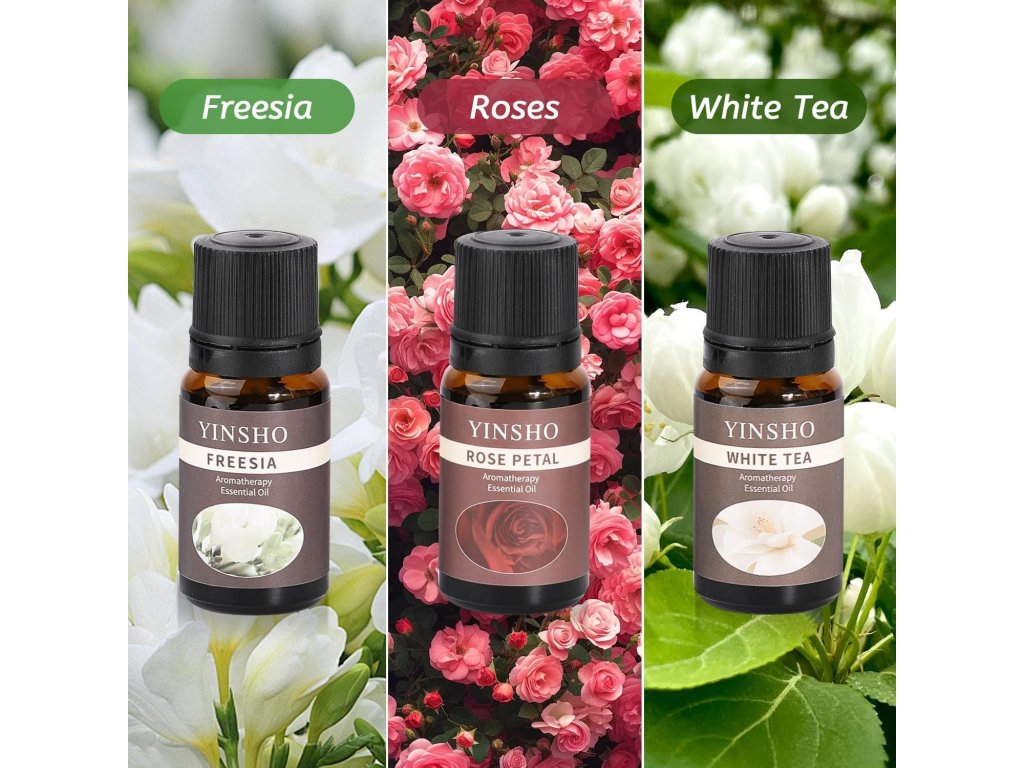 - 🌸 3 prírodné vône: biela čajová ruža, biela čajová frezia a ružový kvet
