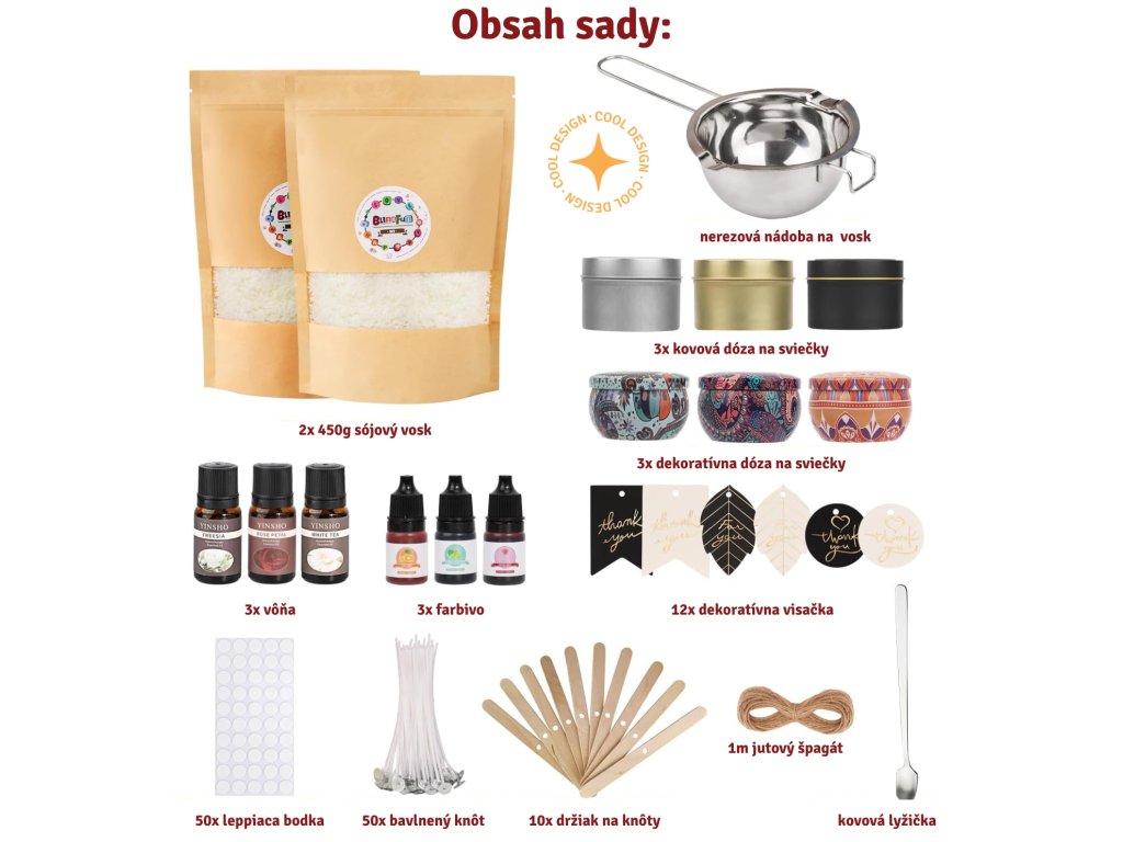 - 🕯️ Obsahuje všetko potrebné – vosk, knôty, nádoby, oleje, farbivá aj pomôcky