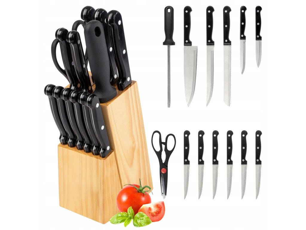Elegantná sada kuchynských nožov ponúka všetko, čo potrebujete pre precízne a pohodlné krájanie. Čepele z kvalitnej nehrdzavejúcej ocele zabezpečujú dlhodobú ostrosť, zatiaľ čo drevený blok slúži ako praktický aj štýlový doplnok do kuchyne. Súprava obsahuje <strongširoký výber nožov na rôzne typy potravín, univerzálne nožnice aj ostrú brúsku pre udržiavanie perfektného rezu.